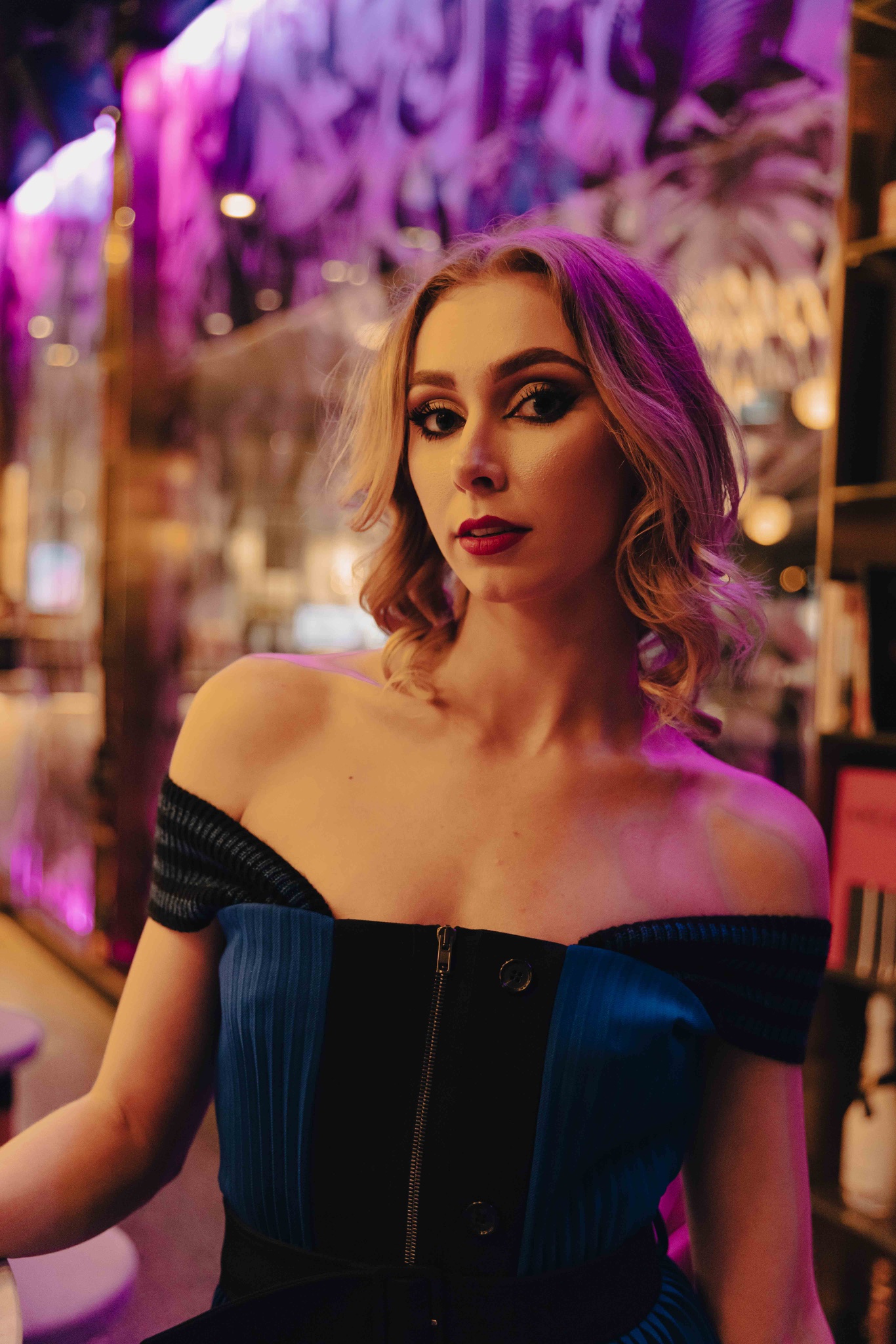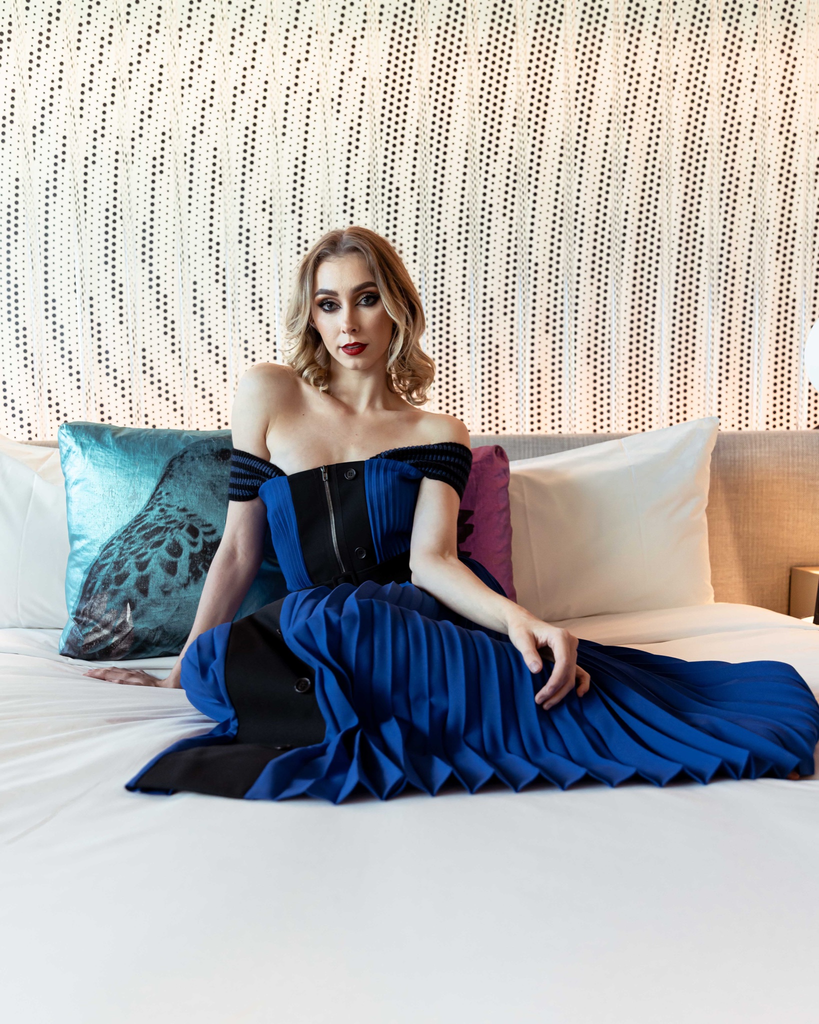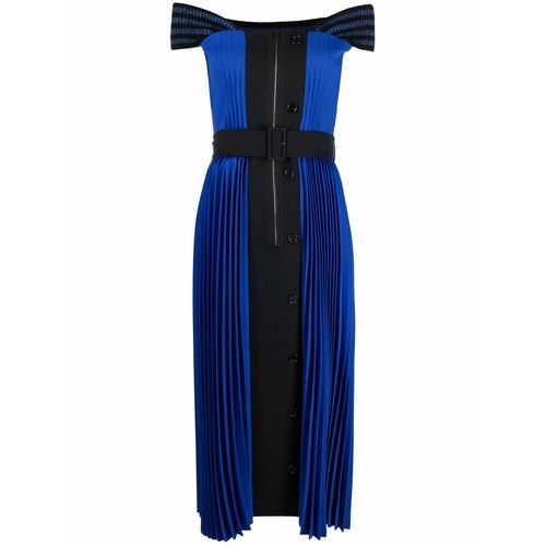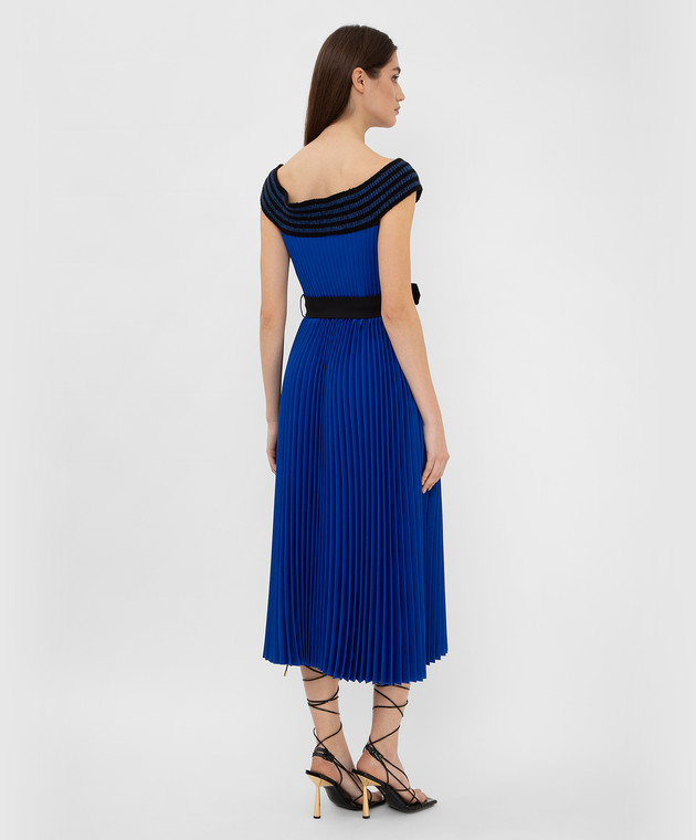 Philosophy di Lorenzo pleated dress in cobalt blue with black trimming.