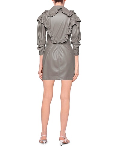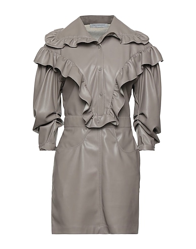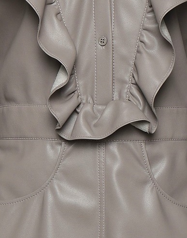 Leather look and very soft. 100% Polyester, Polyurethane resin coated fabric, ruffles, v-neck, solid dove grey colour, 3/4 length sleeves, unlined, multi-pockets, button closing.