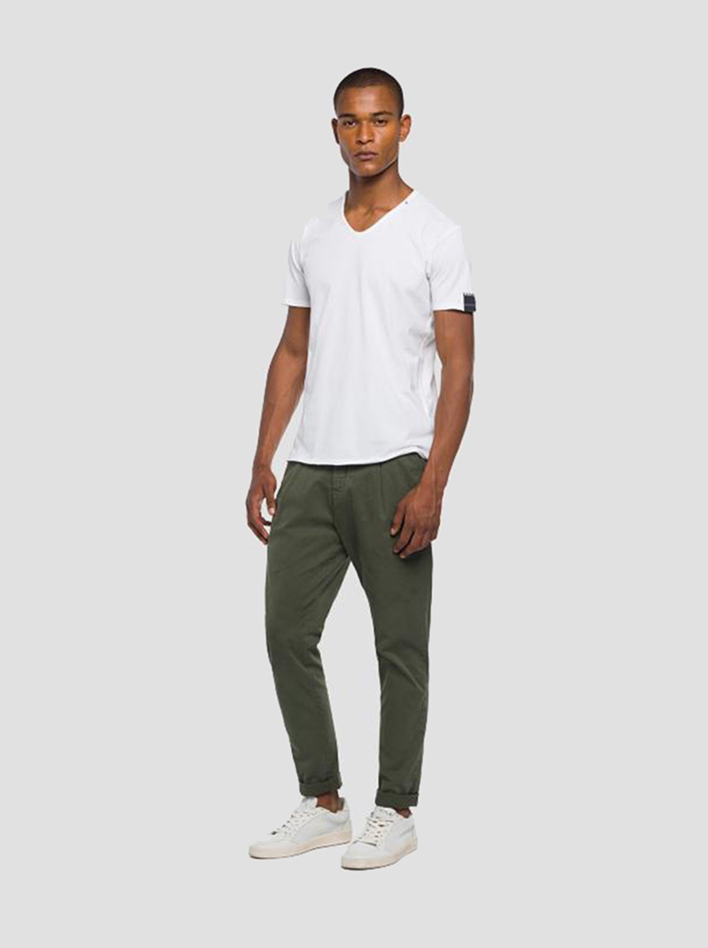 REPLAY – Men’s white v-neck raw cut cotton t-shirt, regular fit with central seam on the back, contrasting piping detailing on the collar, printed logo on the edge of the sleeve and R-shaped embroidery on the collar.